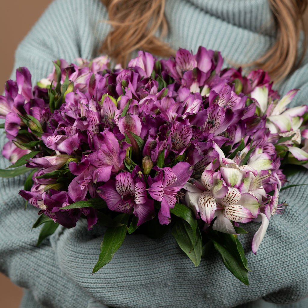 Violet alstroemerias possess a magnetism that is difficult to put into words. Their petals are decorated with delicate strokes and dots — nature has created a true work of art. Each flower is as unique as a fingerprint. You will never find two that are exactly alike.