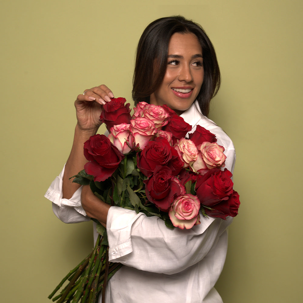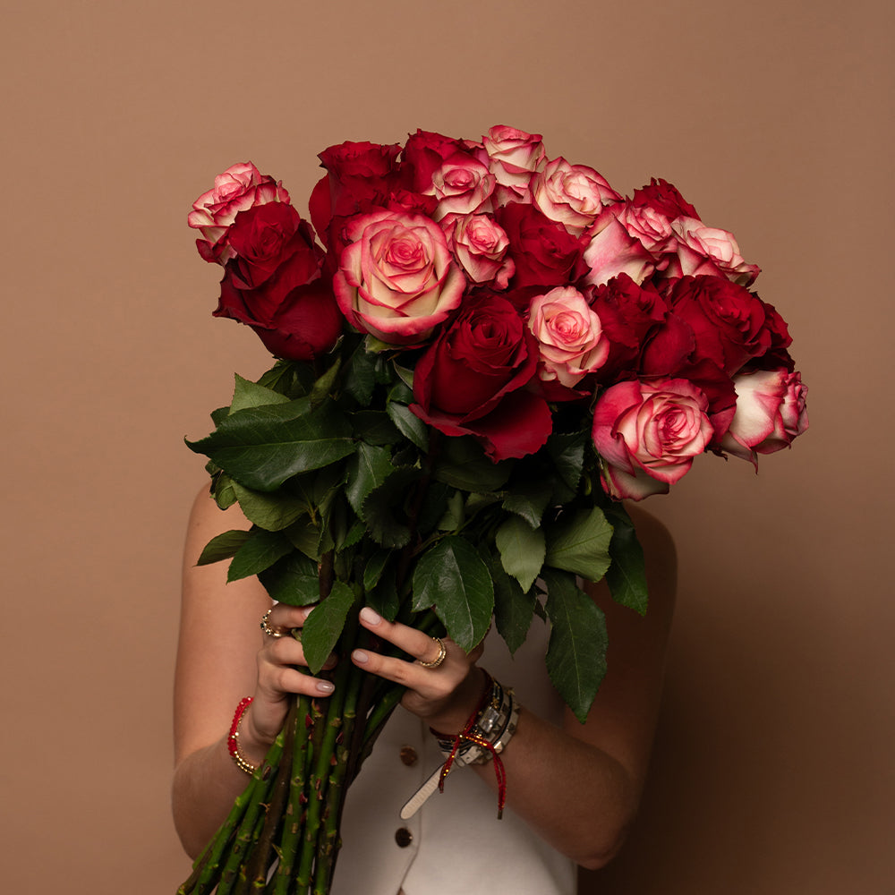Have you decided on a composition of red roses? But how to get them as soon as possible and admire their beauty? It's simple, order delivery of this bouquet from Rosaholics. Our expert florists are on hand to guide you through selecting the perfect bouquet. They will take the time to understand your preferences, helping you to choose the ideal combination of colors, sizes, and varieties to create a stunning bouquet that is uniquely yours. And if you have already decided on the choice of bicolor roses of red and white, you just need to clarify a few details about delivery, and that's it.