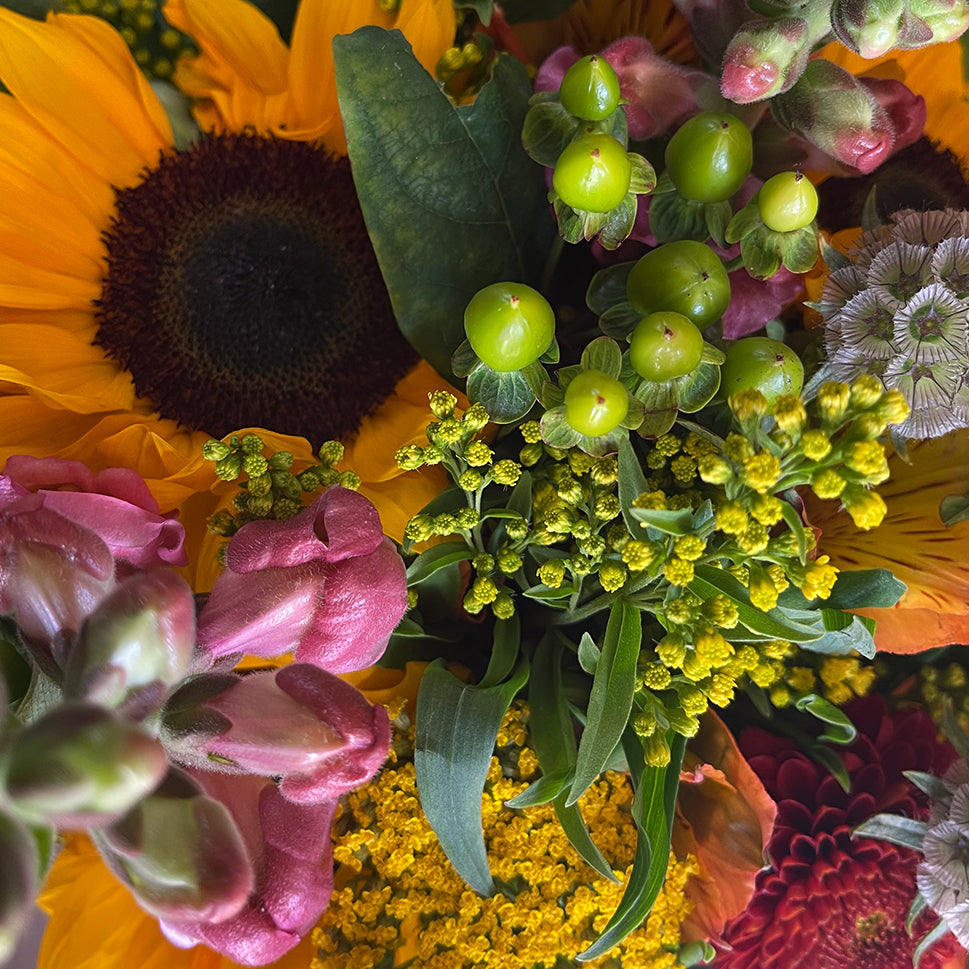 In addition to the sunflowers and chrysanthemums, the Cali bouquet features other bright blooms. They add depth and dimension to the arrangement. Bright blooms bring a touch of playfulness to the bouquet, and tender flowers have a romantic touch. The flowers are thoughtfully arranged to create a balanced and eye-catching collection.