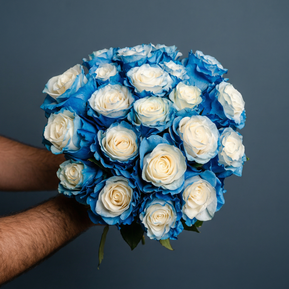 Anniversaries. The blue and white roses bouquet looks incredible and harmonious. Roses are an ideal choice as a gift for an anniversary. The bouquet will demonstrate your admiration for the couple and express all the best feelings. The contrast of white and blue colors of the flowers will allow you to fully enhance the atmosphere of the event.