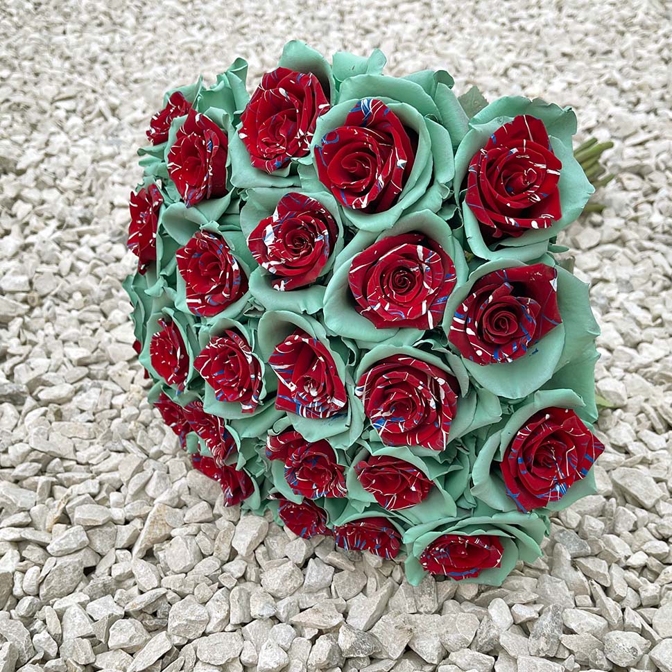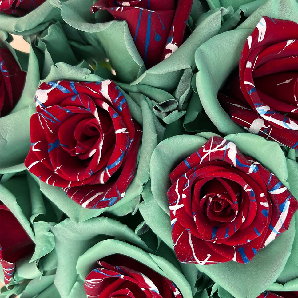 Bicolor petals plus an artsy splash of paint – Merry & Bright is the perfect celebration rose bouquet that can jazz up any party or fun event. Red interior petals are splashed with white and blue, while teal-green petals provide a visual frame around the fun. Fantastic!