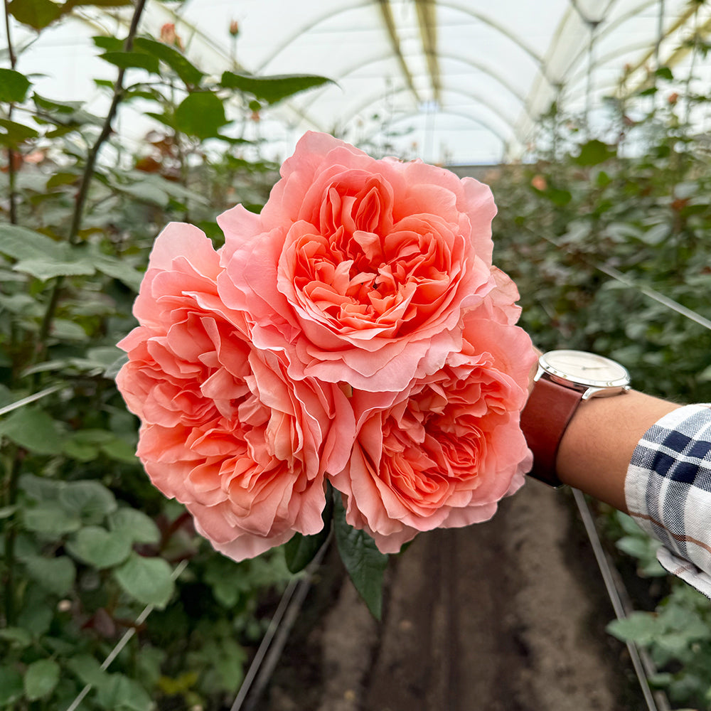 Here, at our Rosaholics shop, we're super proud to offer exclusive rose varieties of the absolute highest quality. We cultivate these stunning coral pink roses on our own farms, with meticulous attention to detail. Every single flower undergoes our strict quality check before it is included in a bouquet. That's how we guarantee that every arrangement is absolutely perfect and will last as long as possible.