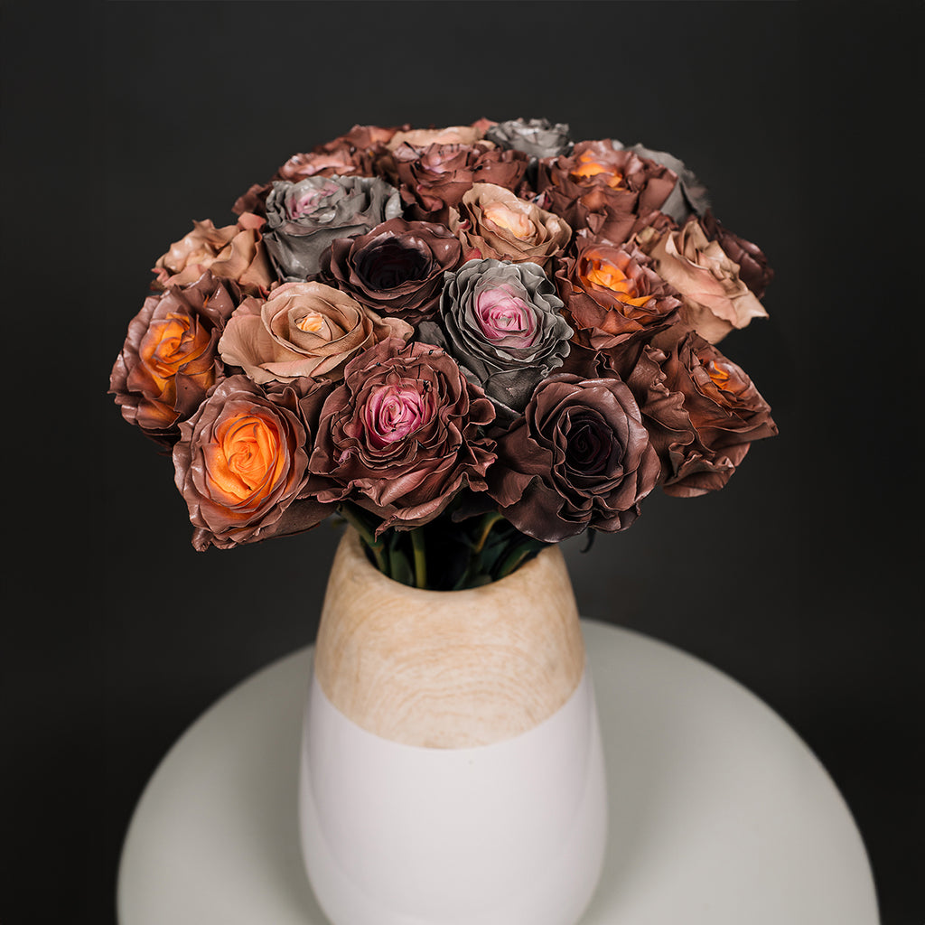 The "Spooky Brew" rose bouquet is a unique and intriguing combination of colors. Each has its own symbolic meaning. Gray, neutral, and balanced. It represents calmness, maturity, and wisdom. It evokes a mysterious aura, causing a sense of stability and sophistication.