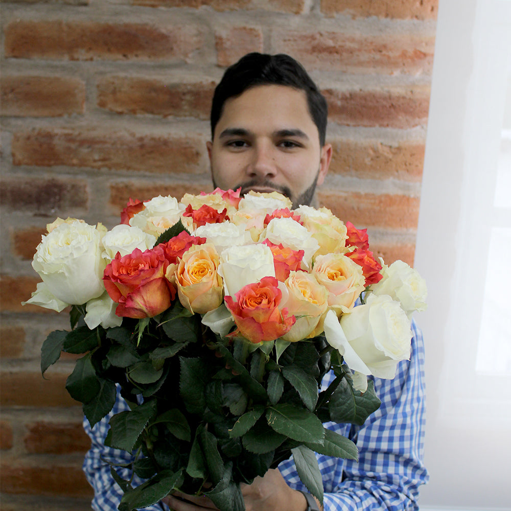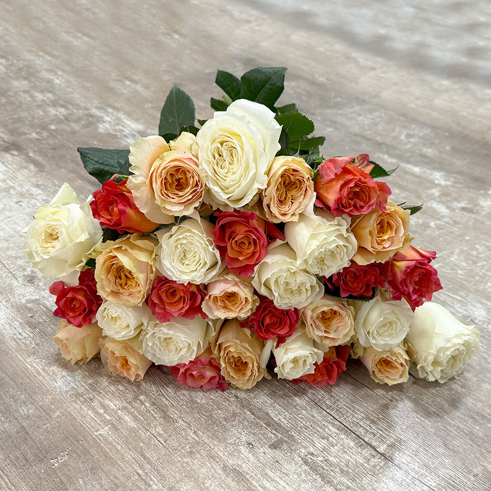 Each flower in the arrangement is selected with special care. This allows our florists to transition smoothly from pure-white roses to delicate peach and rich coral tones. This combination makes the bouquet versatile: