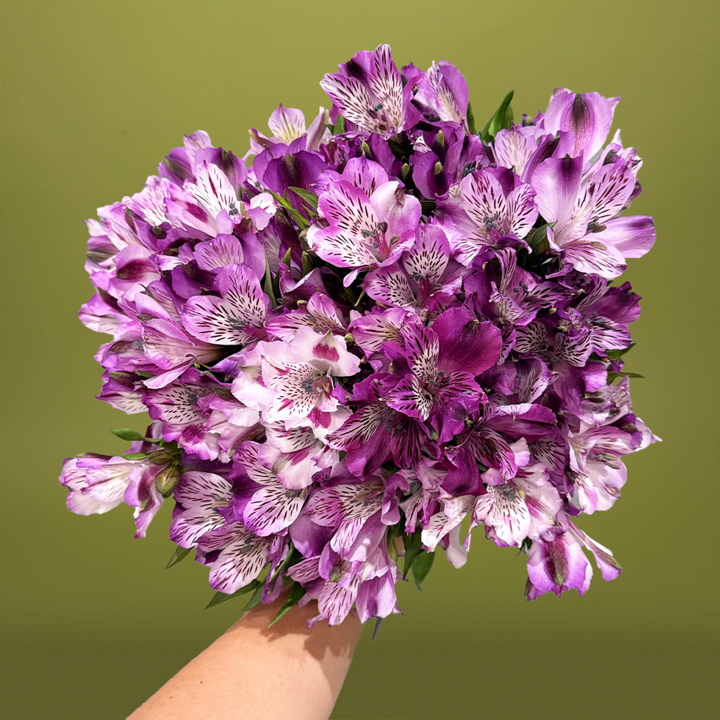 Violet alstroemerias possess a magnetism that is difficult to put into words. Their petals are decorated with delicate strokes and dots — nature has created a true work of art. Each flower is as unique as a fingerprint. You will never find two that are exactly alike.