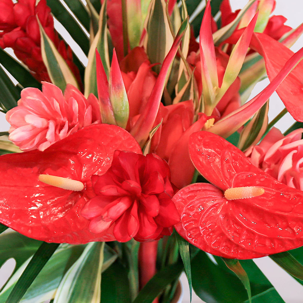While our featured bouquet showcases red, tropical pink flower bouquets often include orchids, proteas, and ginger flowers. Pink anthuriums, with their heart-shaped blooms, are also popular choices. These flowers bring a soft, romantic touch to the bold tropical aesthetic.