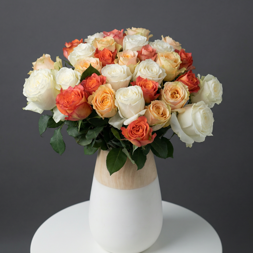 A new masterpiece in the world of floral art is “Blush of Love.” It is a bouquet that embodies the tenderness of first love and the passion of mature love. This romantic bouquet masterfully combines the classic elegance of cream-colored roses with bright coral accents. Together, they create a symphony of colors that can capture any heart.