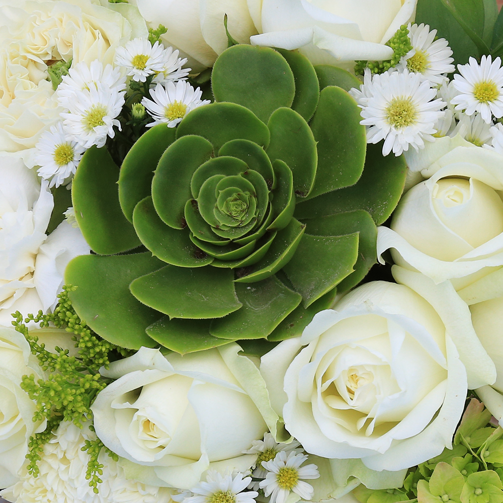 Amazing combination of white roses with succulents and hydrangeas. A classy, elegant bouquet for every occasion.