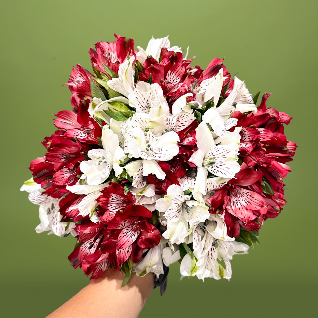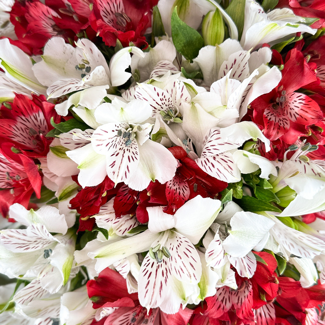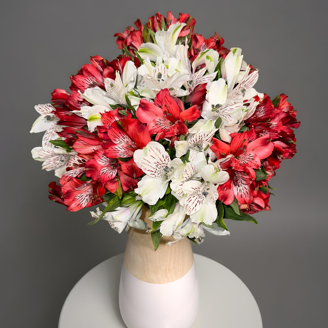 Creating a red alstroemeria bouquet with white accents requires skill and a thorough understanding of floristry. Each stem is placed so that the red and white elements alternate organically, creating rhythm and movement within the composition. It is a handcrafted process that transforms individual flowers into a single work of art.